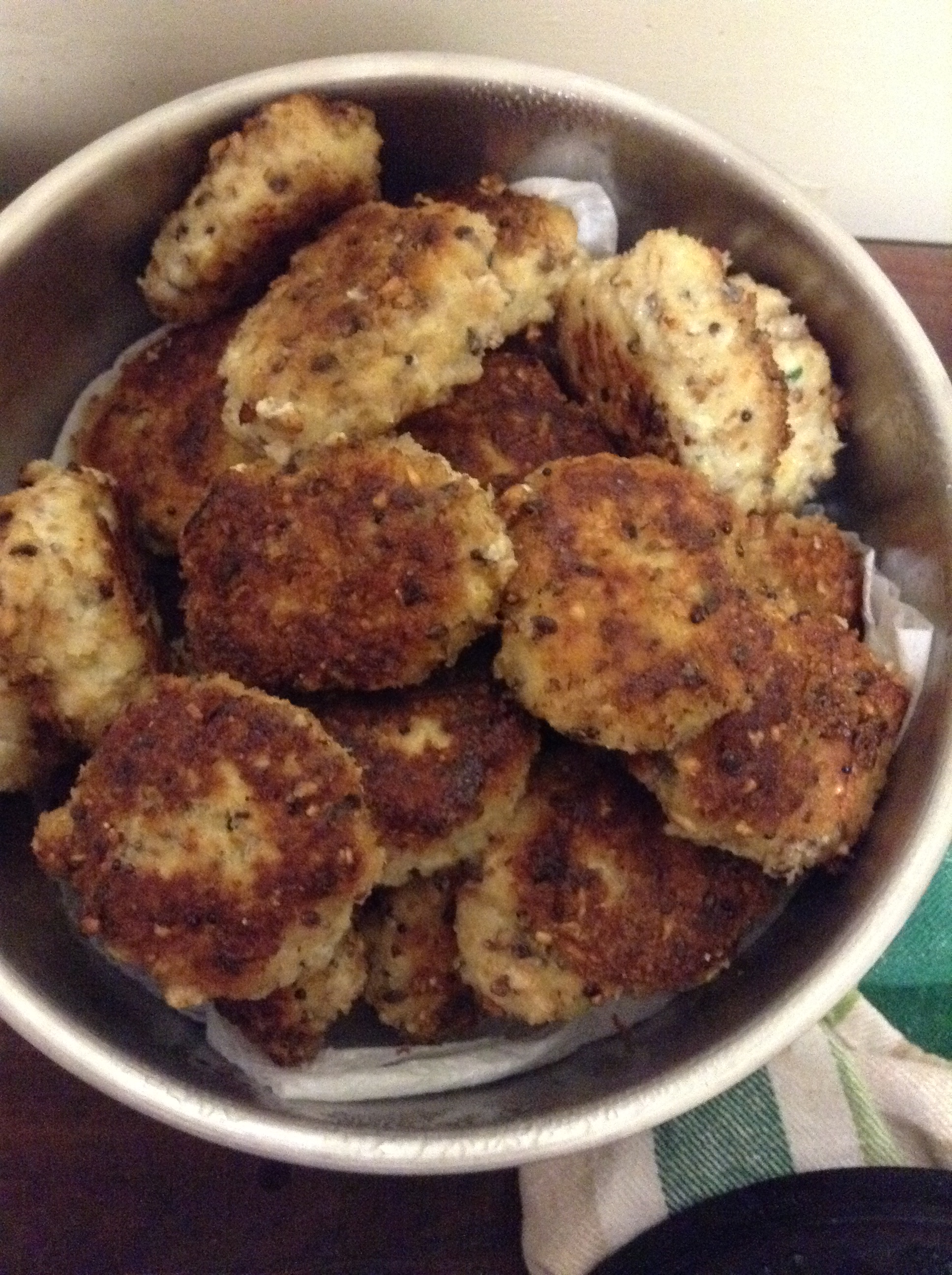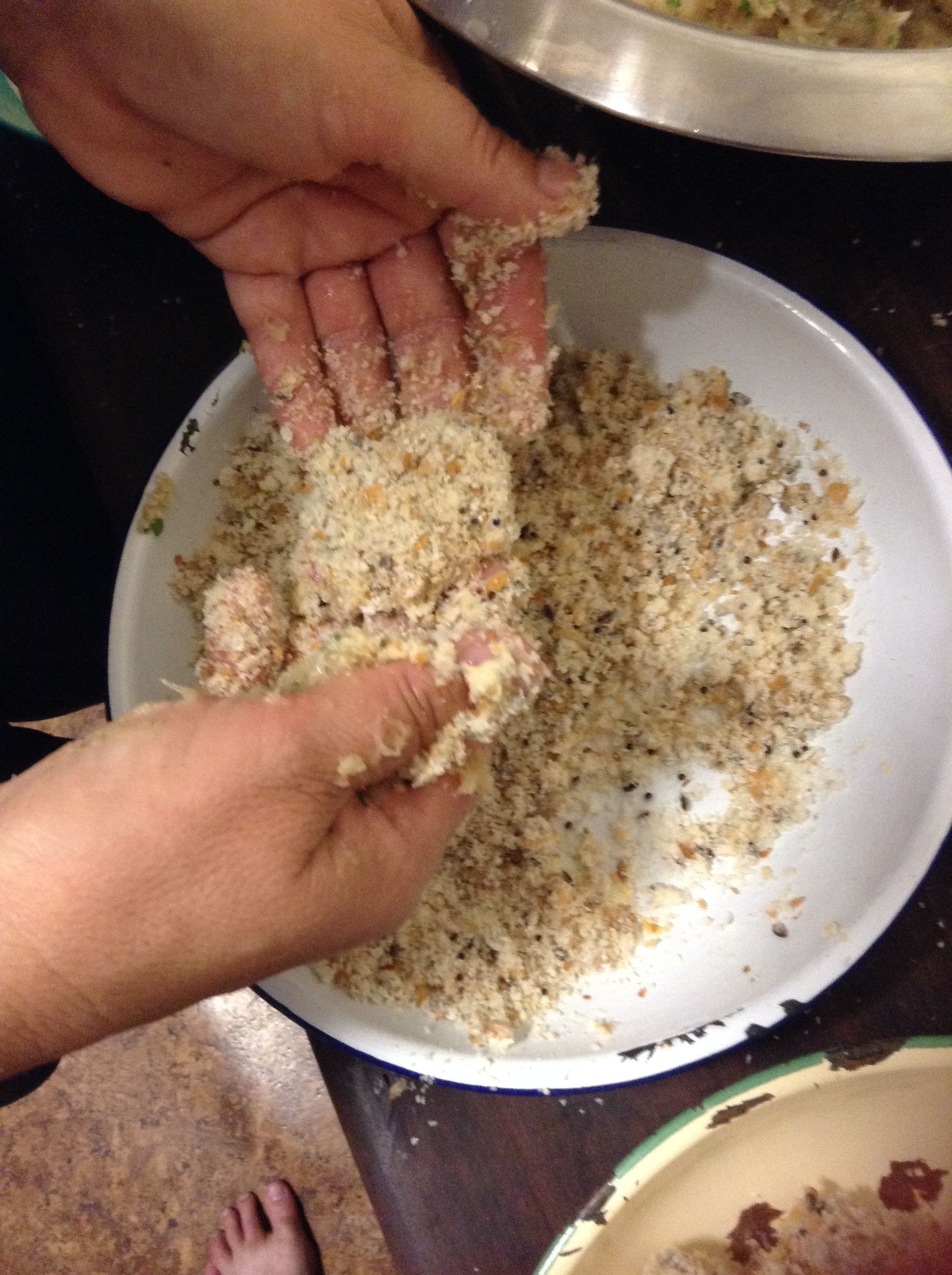 Anyway carry on mixing it up and making an egg wash dish and then a crumbing dish – done. Now this is the not fun part – make little nugget sized balls put in wash and then roll in breadcrumbs – sounds easy. You think this might be a tad messy – well it is. It’s even worse when you drop a little bit on the floor but your hands are so messy that you think to yourself “Oh I’ll get that bit later” then when you run out of breadcrumbs you turn to get some more and you step your toes fair into that little bit that you’ve just dropped on the floor – but you can’t bend down and wipe it out from between your toes because you’ve got all manner of ingredients all over your hands. dilemma here do I continue with mush between my toes or do I wash my hands and then clean my toes??? Although it’s tempting to wash your hands at this point because you’d love another slurp of your wine??? I’d love to hear what you think I did.
