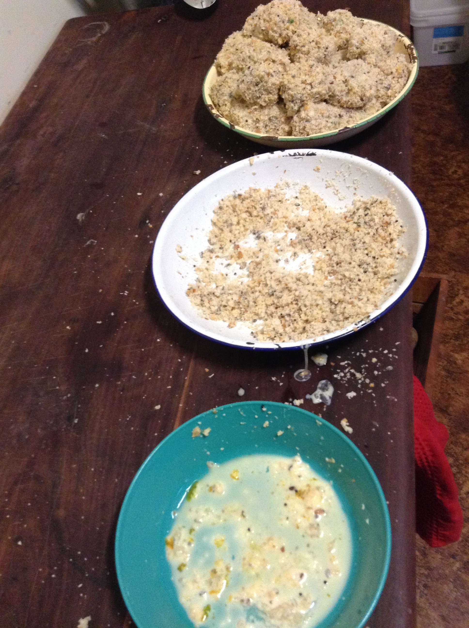 roll small nugget sized balls then put in egg wash then roll in breadcrumbs – do this 47000 times and try not to drop any on the floor – and here’s the thing – you can’t drink wine whilst you do this because your hands are sooooo sticky and gooey – so by the time you’ve finished rolling you are really desperate for a drop.