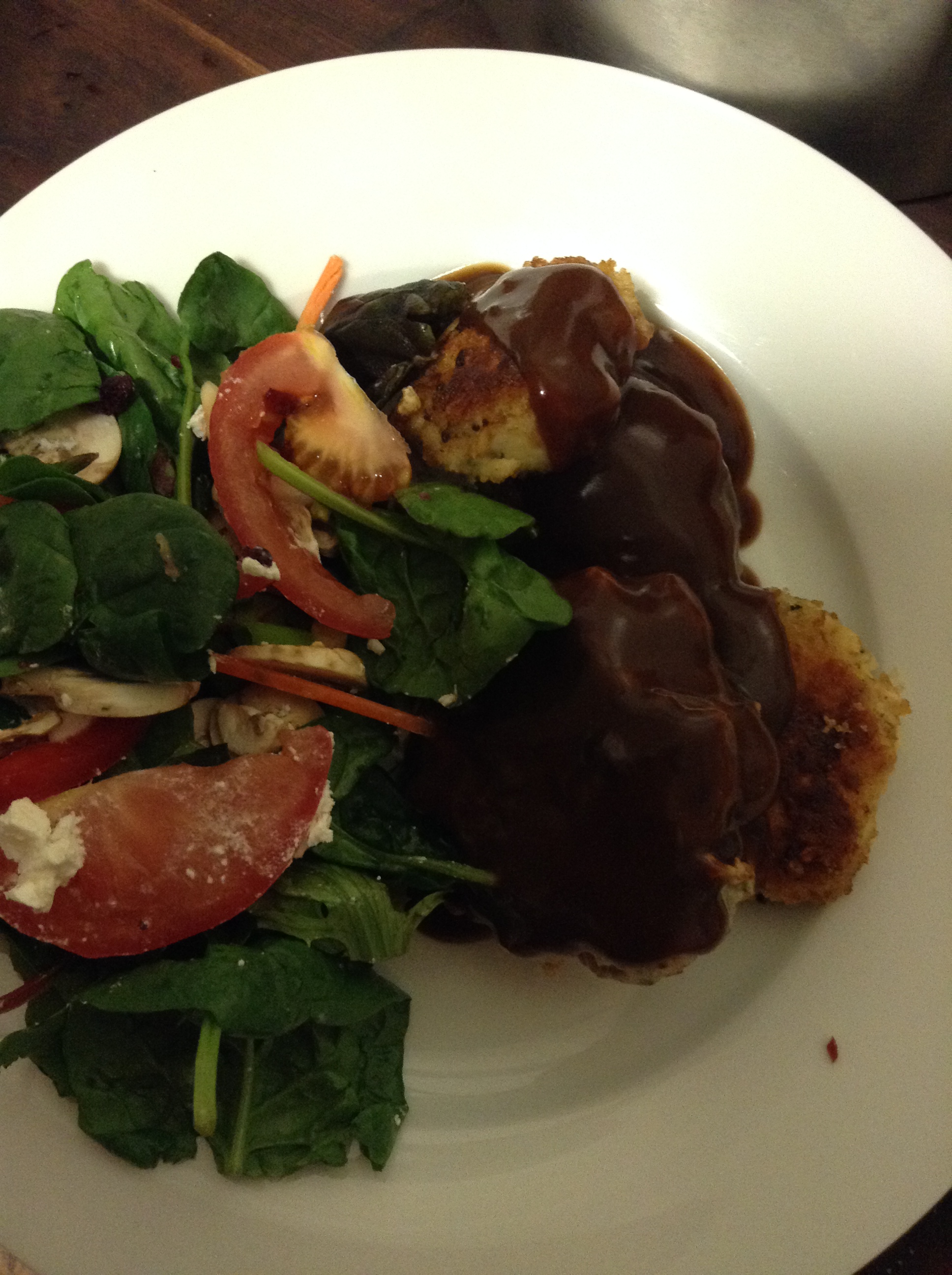 I found it quite frustrating rolling those little nuggets as many times as I did- but I persevered, but I was knackered at the end so I canned the vegetable idea and made a nice salad instead,some gravy and scoffed a nice glass of wine